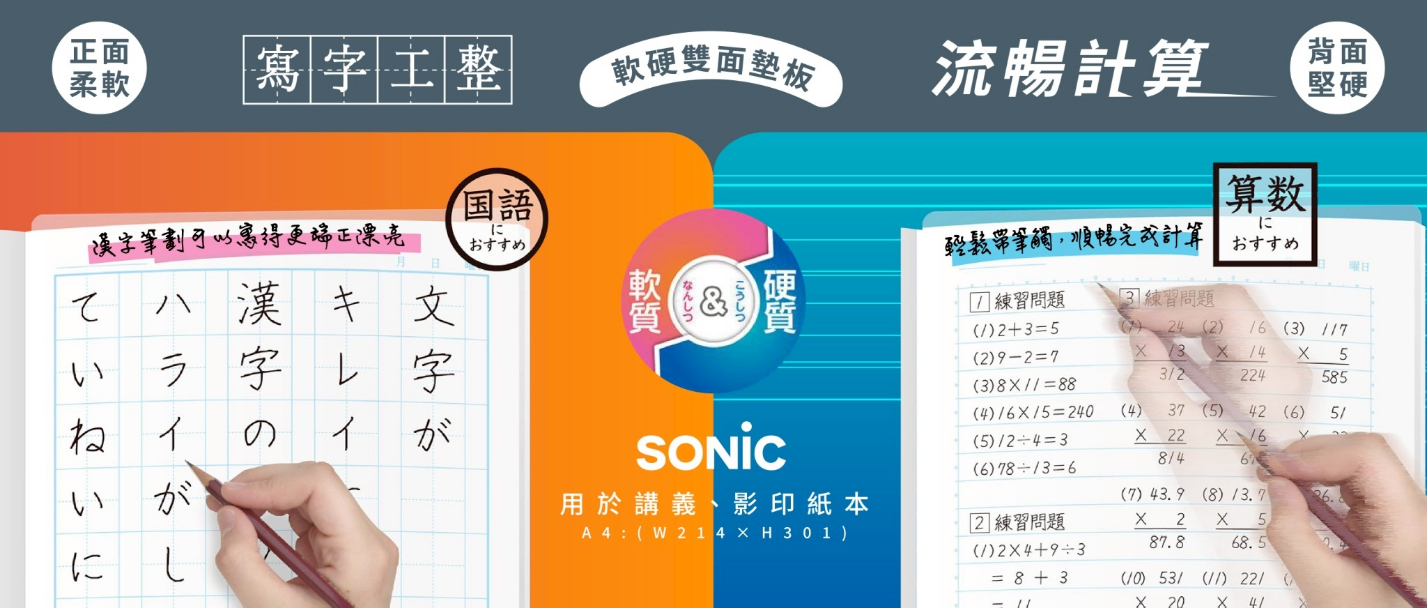 日本 SONIC 推出的 A4 軟硬雙面墊板,在台灣門市熱賣中!一片就能同時滿足孩子的國語練字與算數需求,也是練字族最愛的書寫神器。